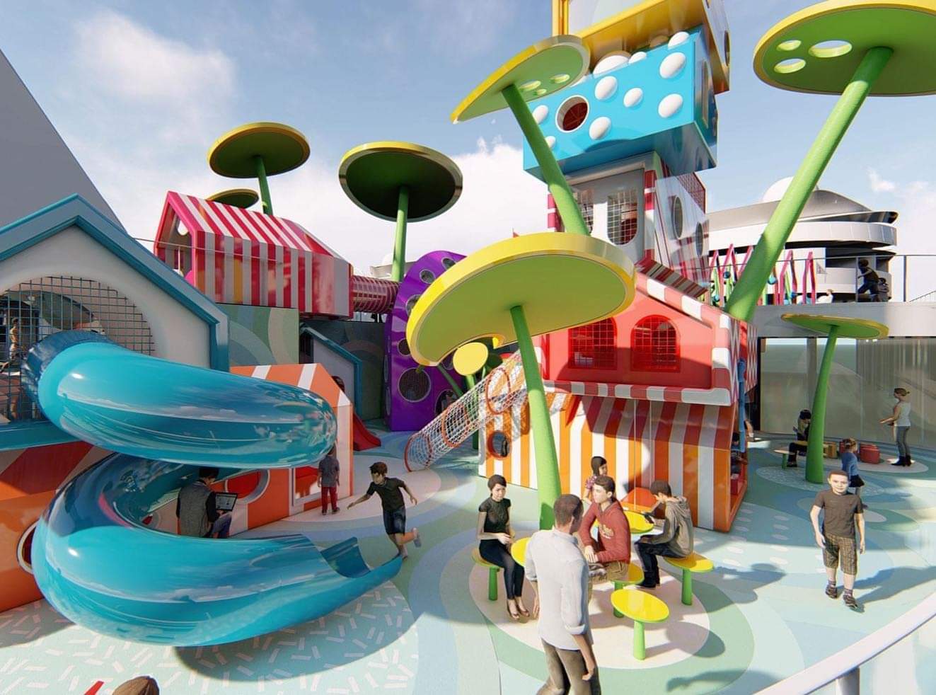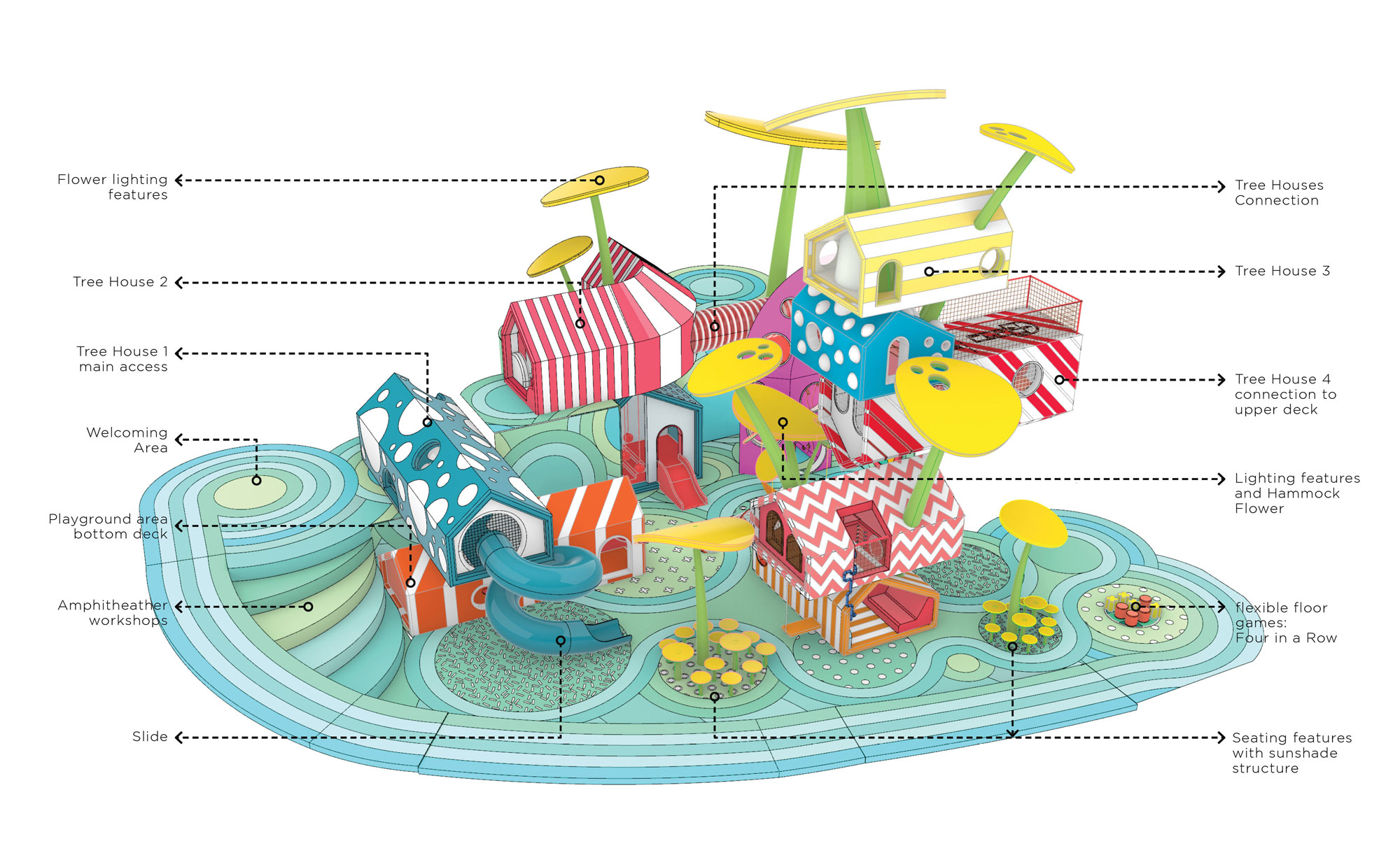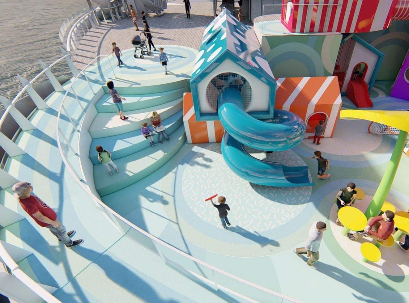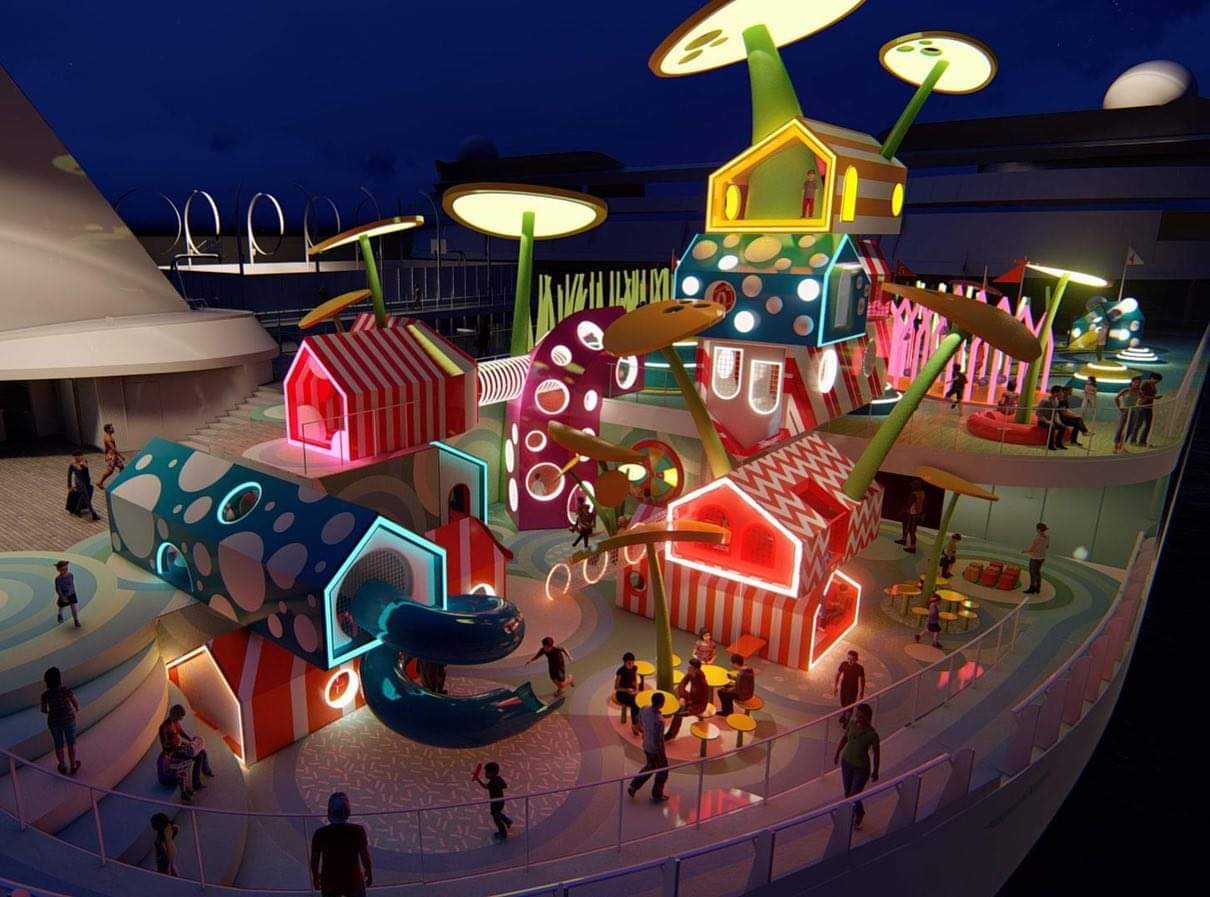 A description on the 100architects website, explains: “The design includes two decks; the lower which is the main playground space where surreal trees and gigantic flowers rise to the sky creating structures for habitable houses with playground functions inside. This area is both, a playground and an open public space inside the cruise where kids and adults can find fun activities to explore.”